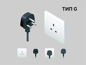 Здесь розетки типа G — три прямоугольных “пальца”, как в Англии.